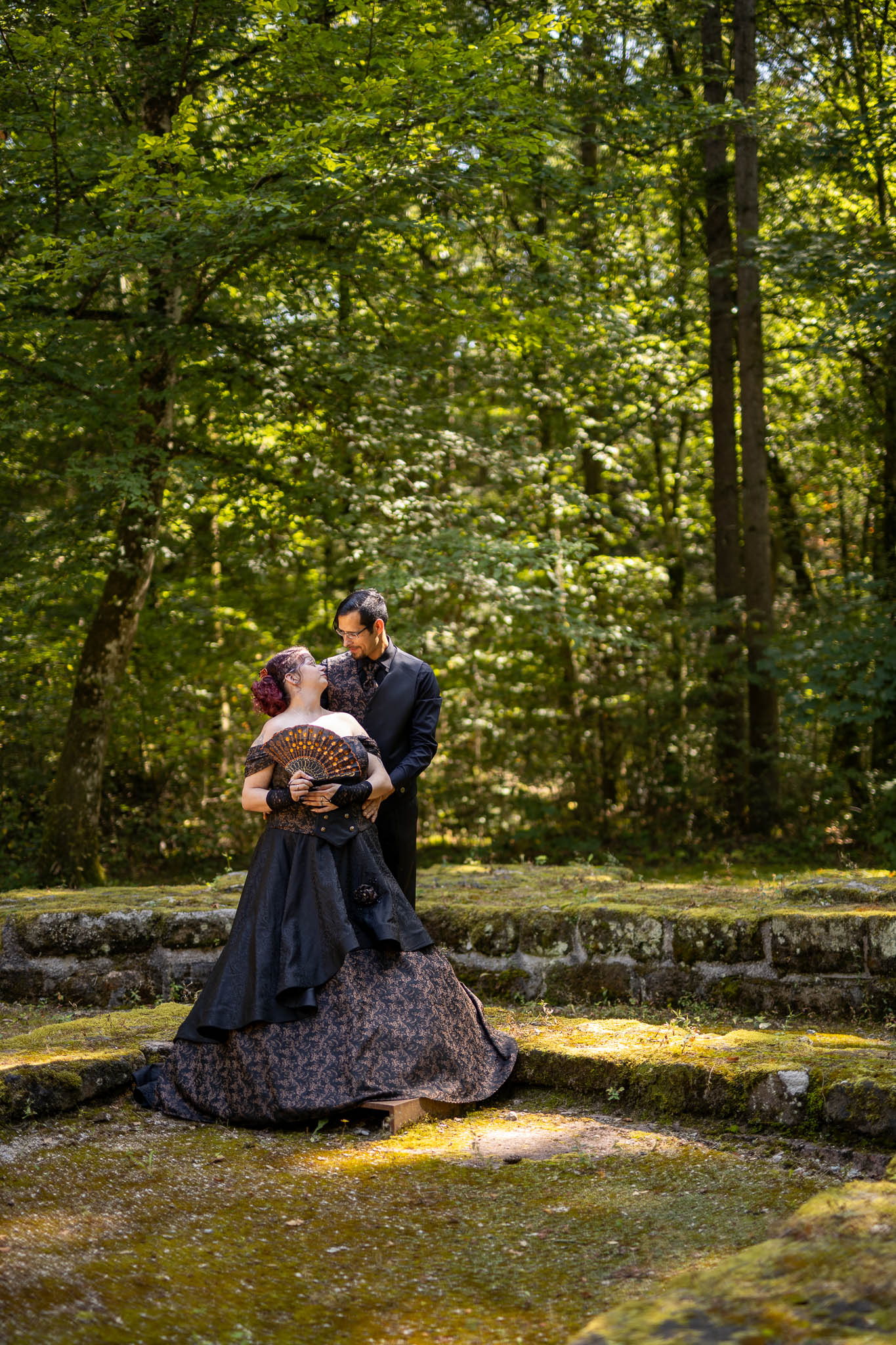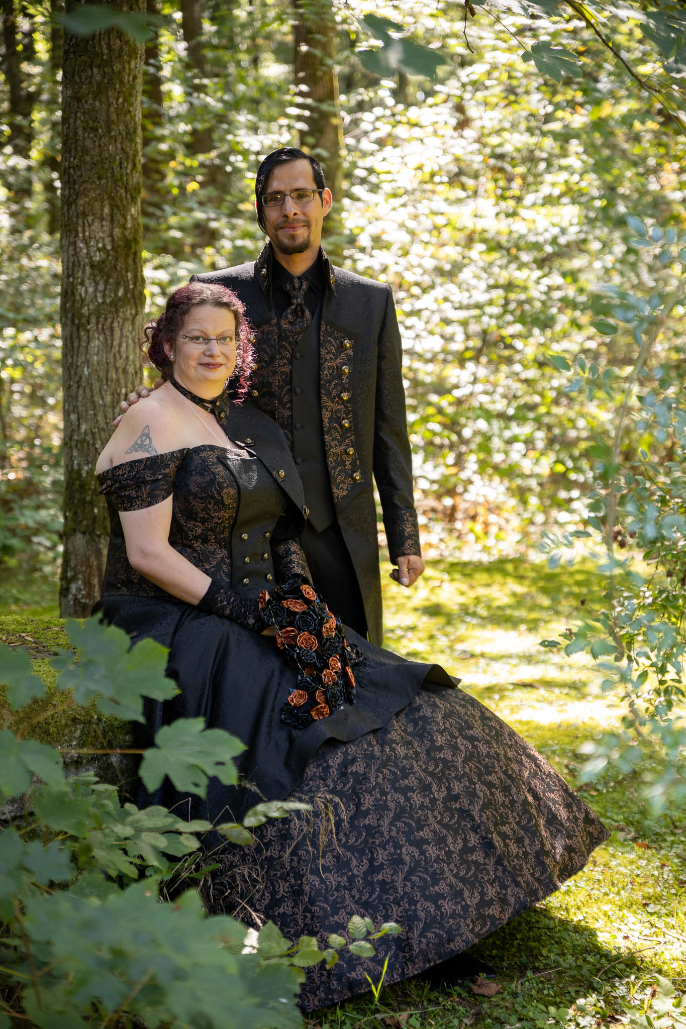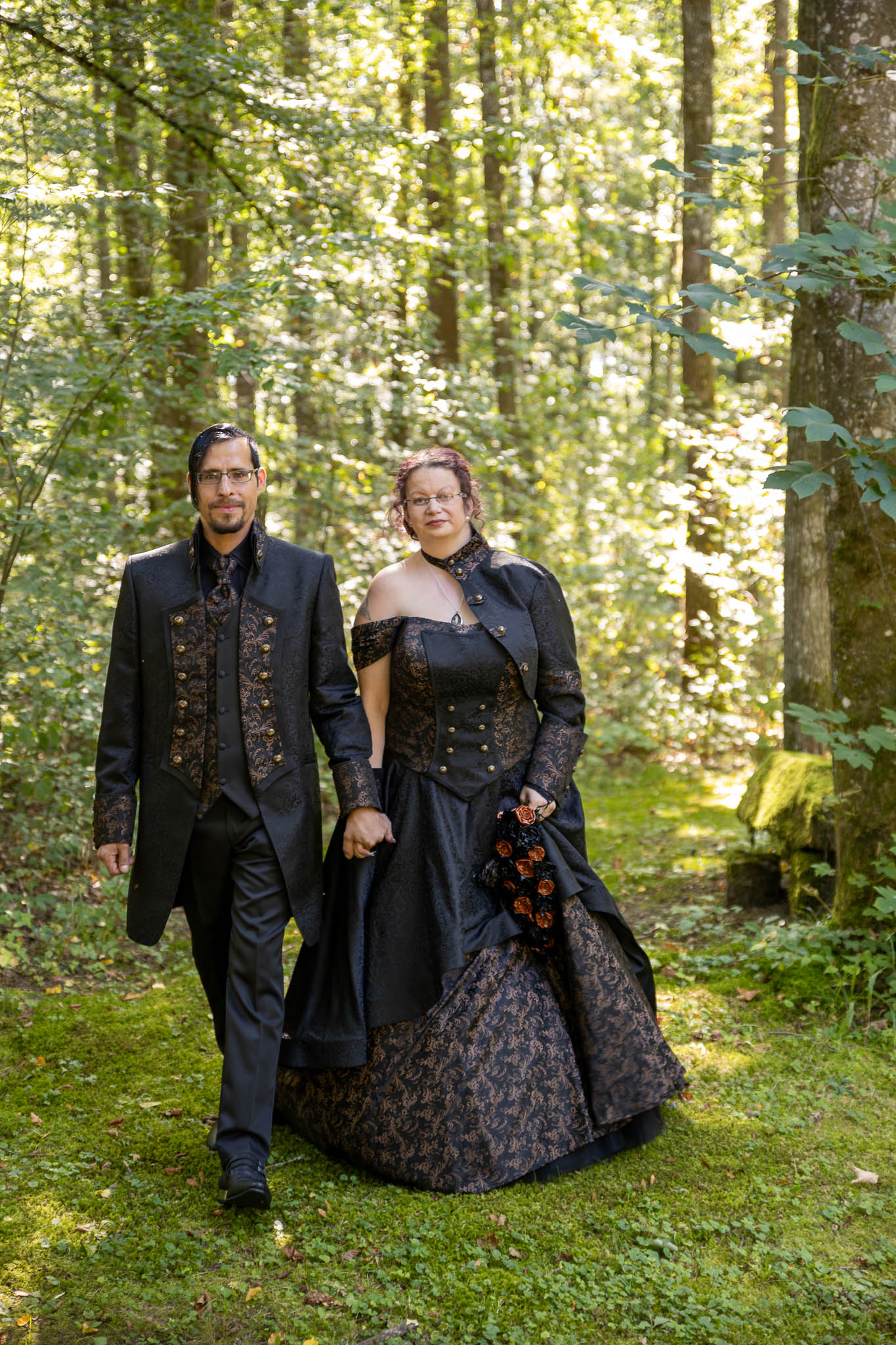 Die alten Mauern der Ruine erzählten Geschichten vergangener Zeiten. Martina und Marco hatten sich dazu entschieden, ihre Outfits bei der renommierten Designerin Lucardis Feist anfertigen zu lassen, die sich auf außergewöhnliche Brautkleider und Anzüge spezialisiert hat. Ihr Brautkleid war eine kunstvolle Kreation aus schwarzem Stoff, verziert mit bronzefarbenen Ornamenten, die die dunkle Eleganz des Anlasses widerspiegelte. Marcos Anzug, ebenfalls von Lucardis Feist, harmonierte perfekt mit Martinas Kleid, und zusammen bildeten sie ein imposantes Bild, das in der Kulisse der Ruine eindrucksvoll zur Geltung kam.