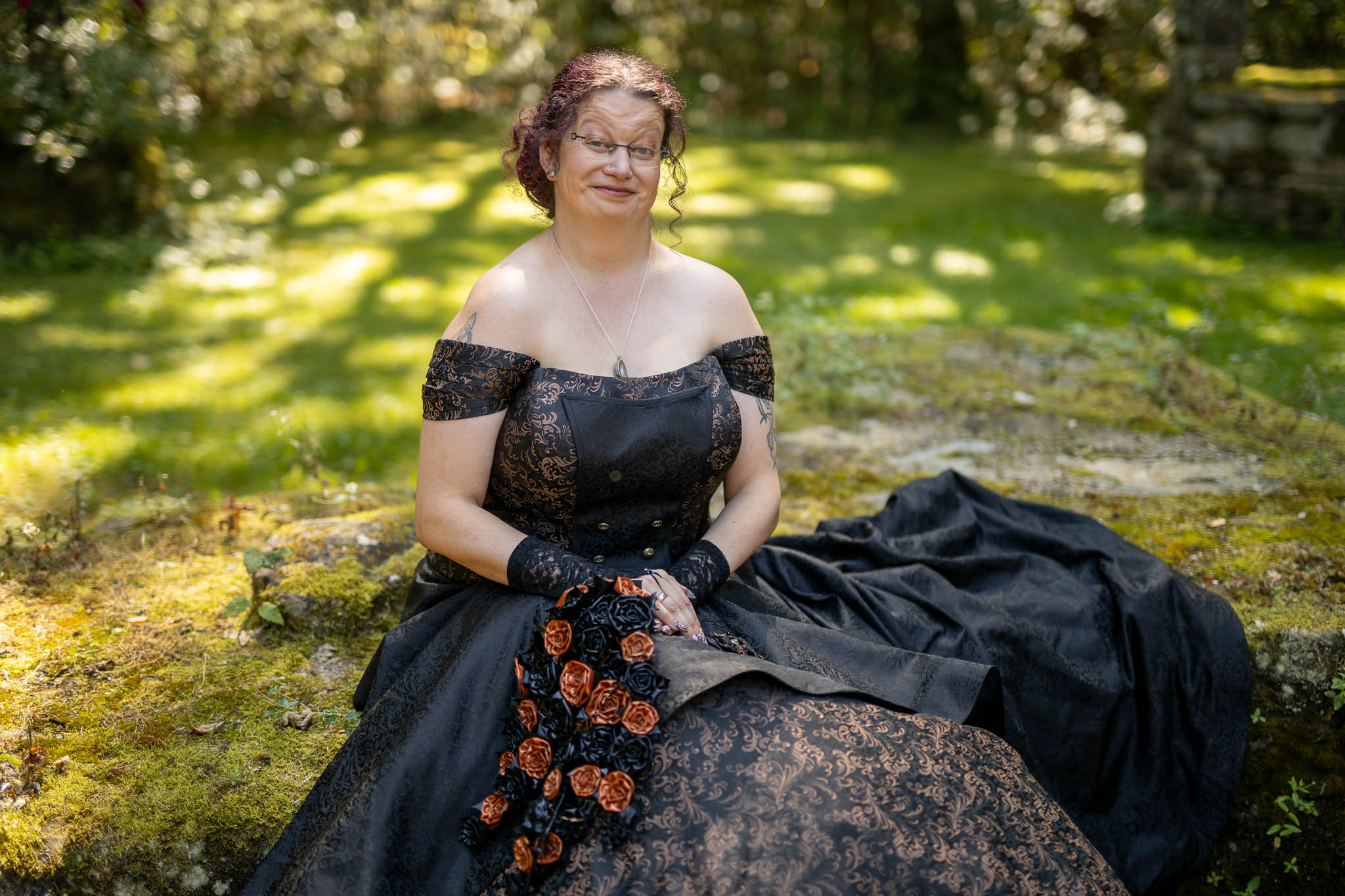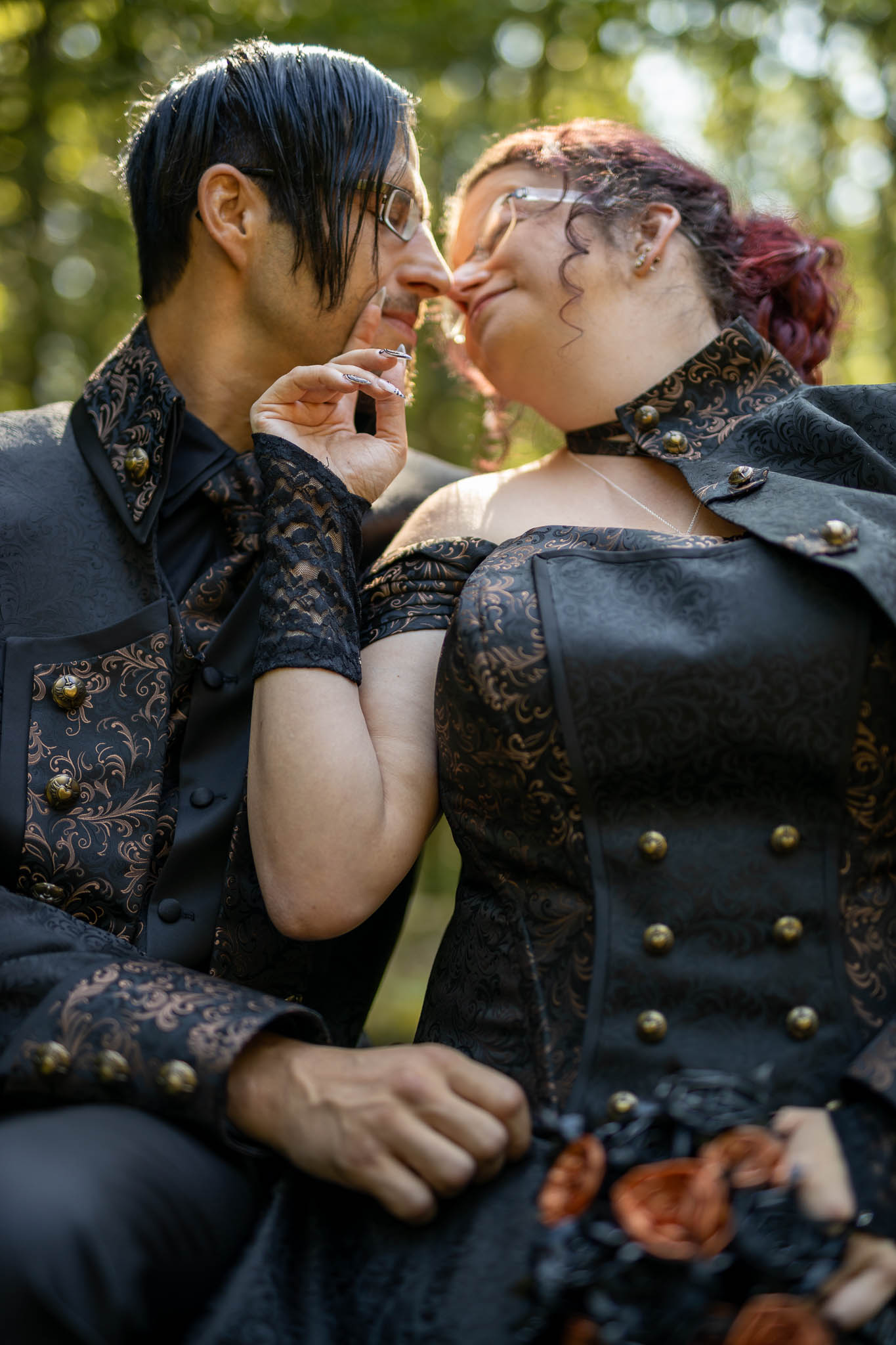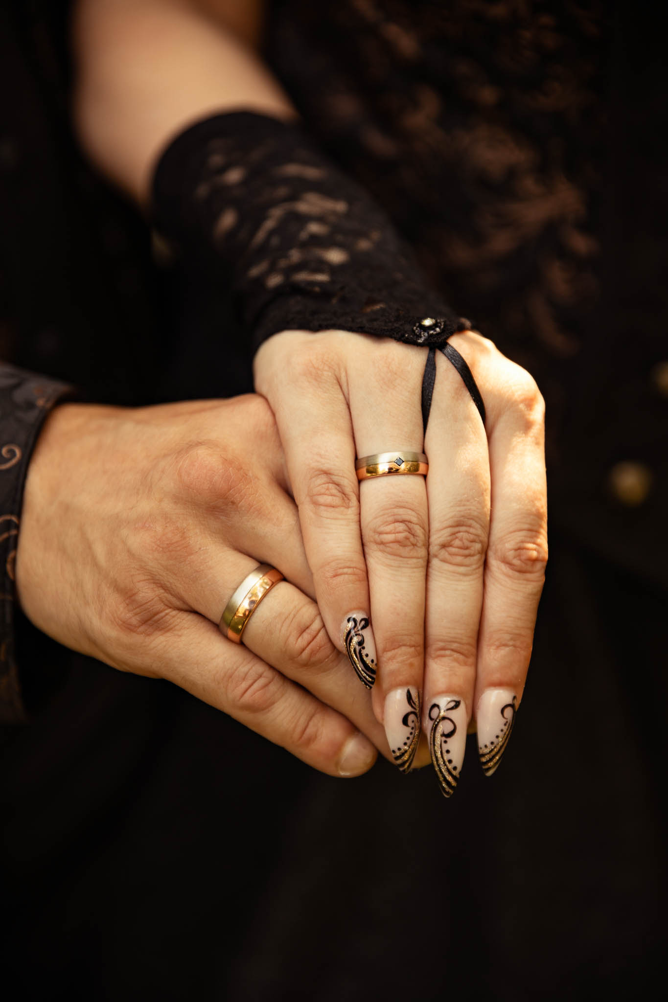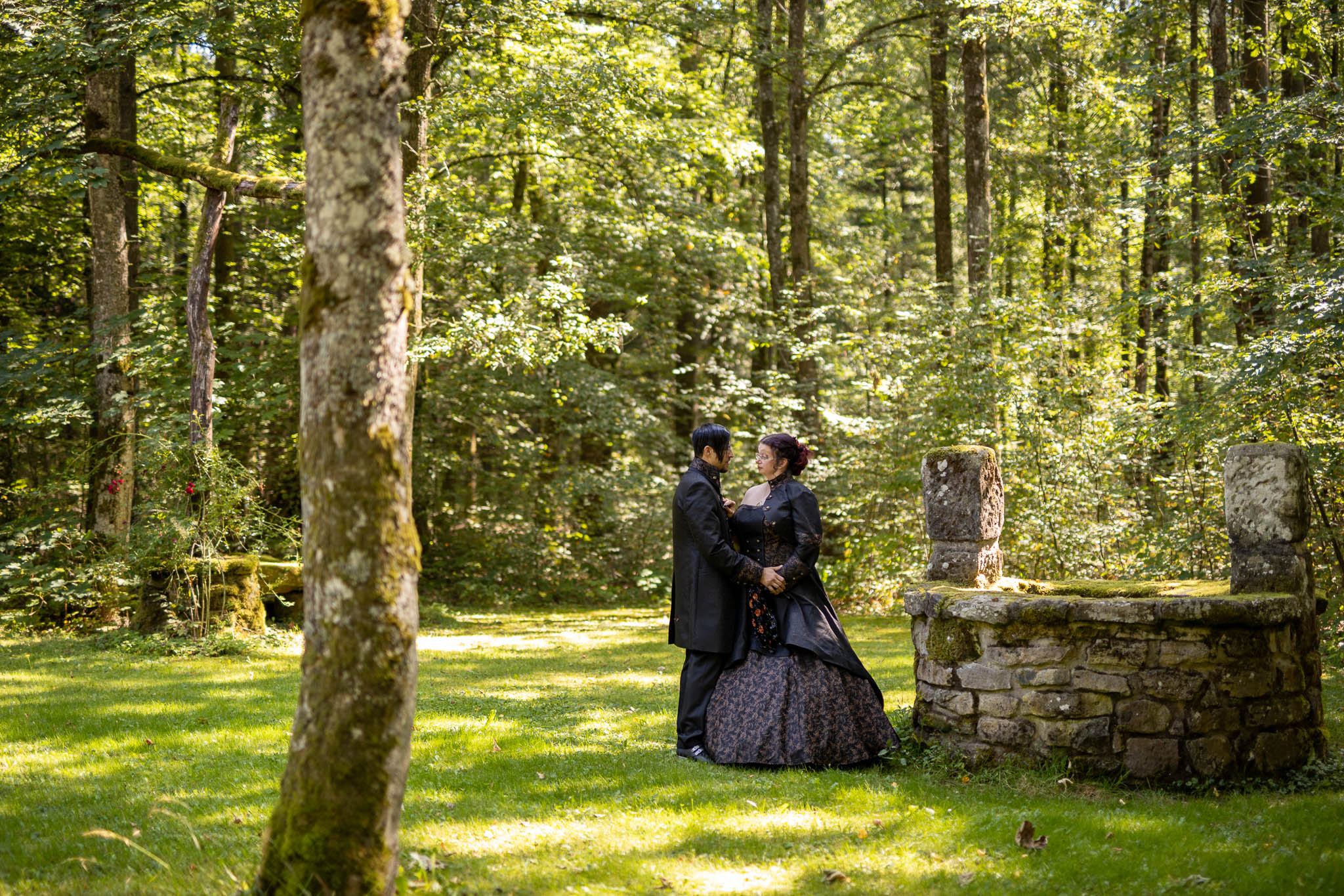 Die alten Mauern der Ruine erzählten Geschichten vergangener Zeiten. Martina und Marco hatten sich dazu entschieden, ihre Outfits bei der renommierten Designerin Lucardis Feist anfertigen zu lassen, die sich auf außergewöhnliche Brautkleider und Anzüge spezialisiert hat. Ihr Brautkleid war eine kunstvolle Kreation aus schwarzem Stoff, verziert mit bronzefarbenen Ornamenten, die die dunkle Eleganz des Anlasses widerspiegelte. Marcos Anzug, ebenfalls von Lucardis Feist, harmonierte perfekt mit Martinas Kleid, und zusammen bildeten sie ein imposantes Bild, das in der Kulisse der Ruine eindrucksvoll zur Geltung kam.
