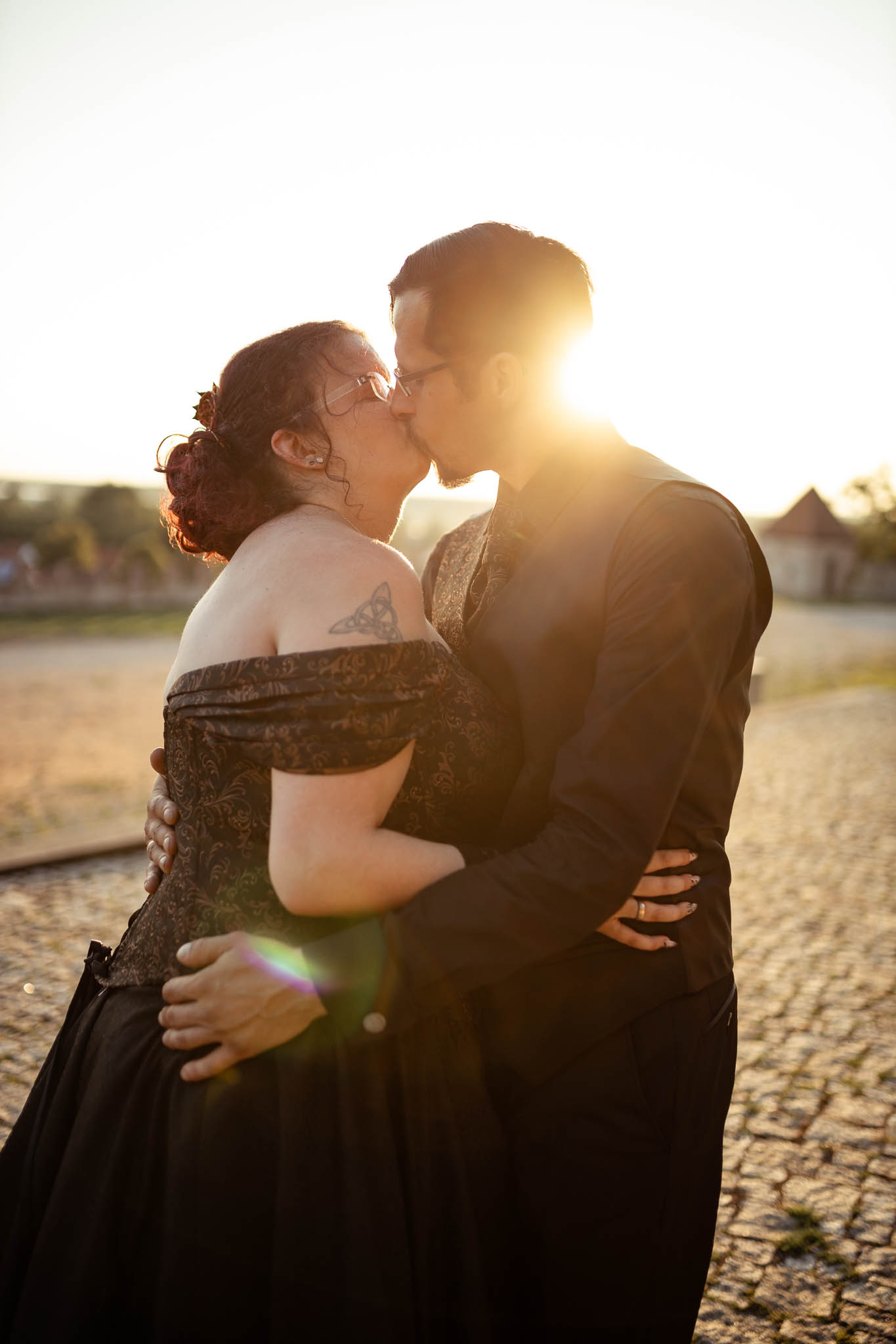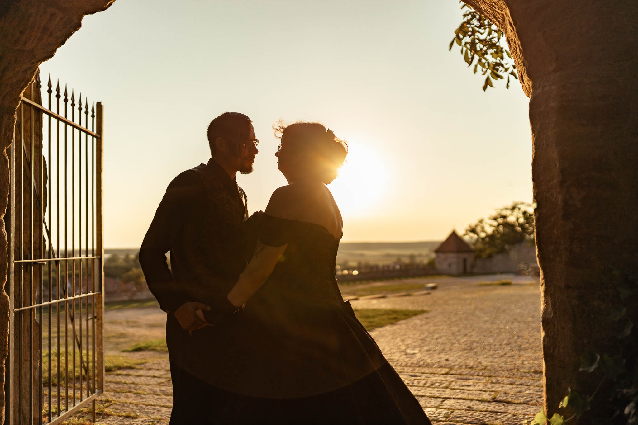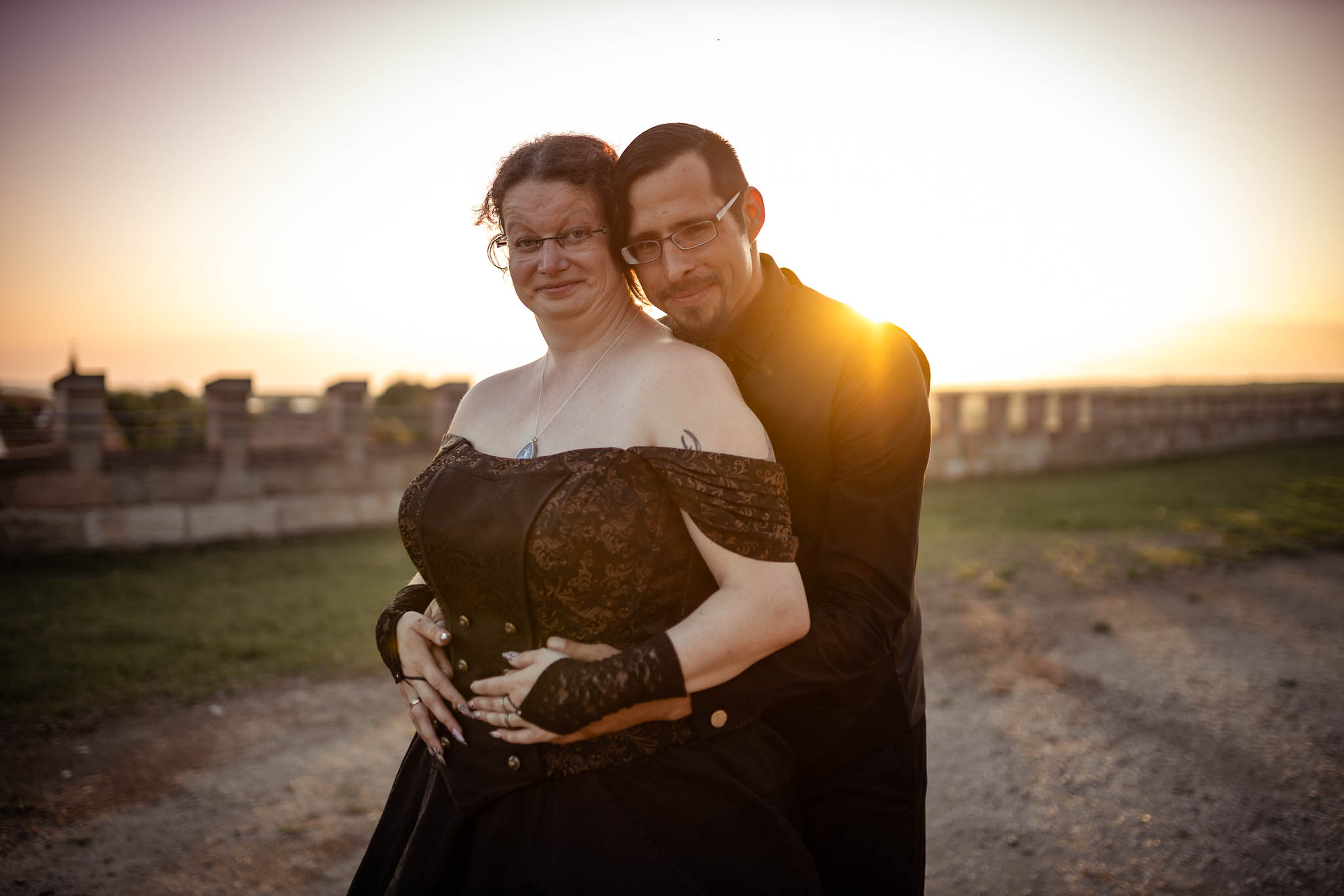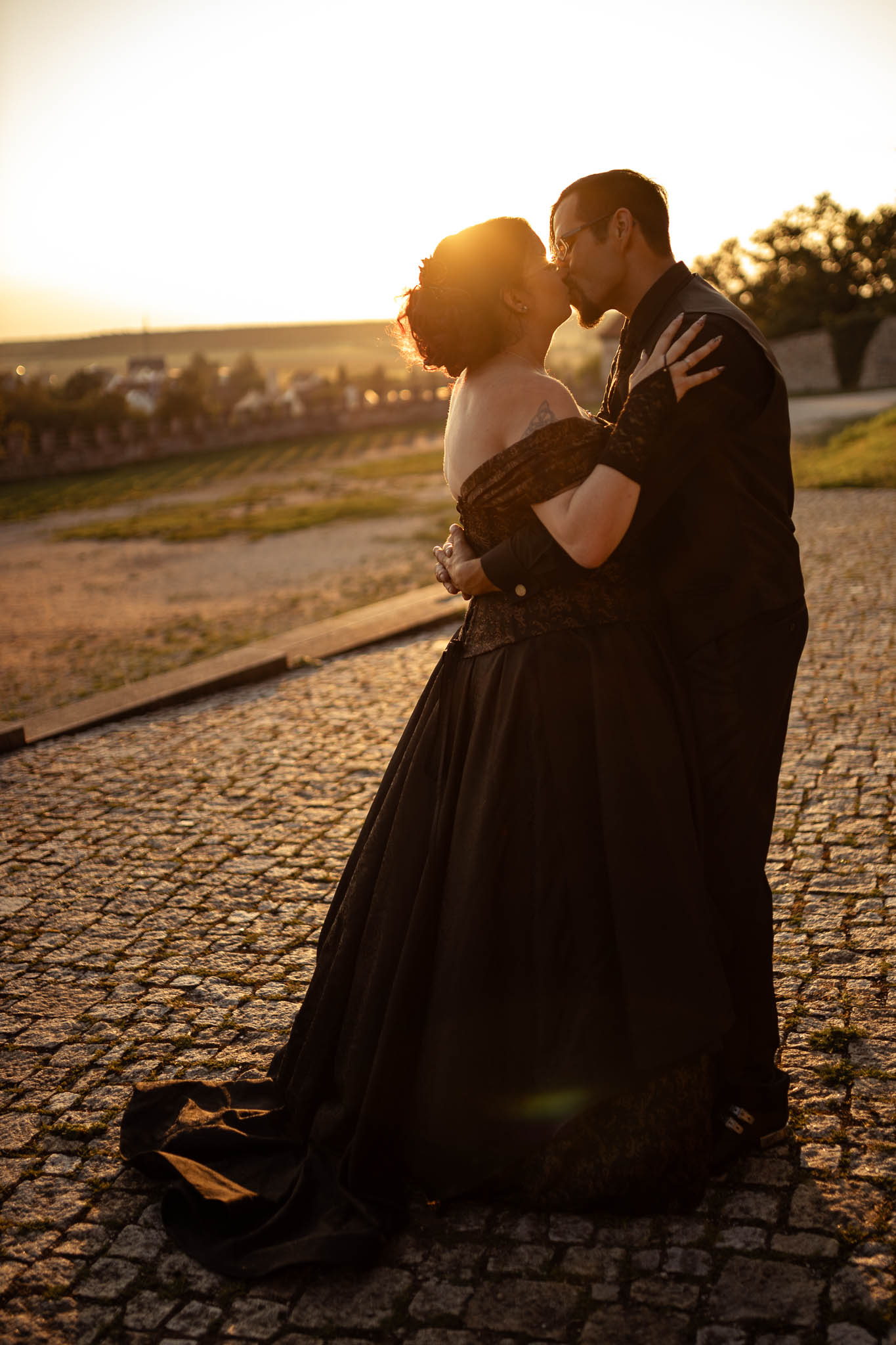 Um halb Acht Uhr, während die Gäste ihren Hauptgang genossen, klingte das Brautpaar sich mit mir für ein intimes Sonnenuntergangsshooting am Turnierplatz der Burg für einige Minuten aus. Diese Momente der Zweisamkeit waren für Martina und Marco besonders wertvoll, da sie in der atemberaubenden Abendstimmung, die die Burg umgab, ihre Liebe in Ruhe genießen konnten. Das Licht war perfekt – die goldenen Strahlen der untergehenden Sonne tauchten die Szene in eine fast magische Atmosphäre, die durch das Schwarz ihrer Outfits noch verstärkt wurde. Hier zeigte sich wieder einmal, warum ihr euch unbedingt die Option auf ein Sundownshooting an eurem Tag mit ein wenig Spielraum im Zeitplan um die entsprechende Uhrzeit offenhalten solltet. Und ich kann euch beruhigen: Auch für Martina, Marco und mich war nach unserer Rückkehr noch genu zu essen übrig, bevor dann noch das Dessert in Form von gefüllten Pfannkuchen mit Eis serviert wurde.