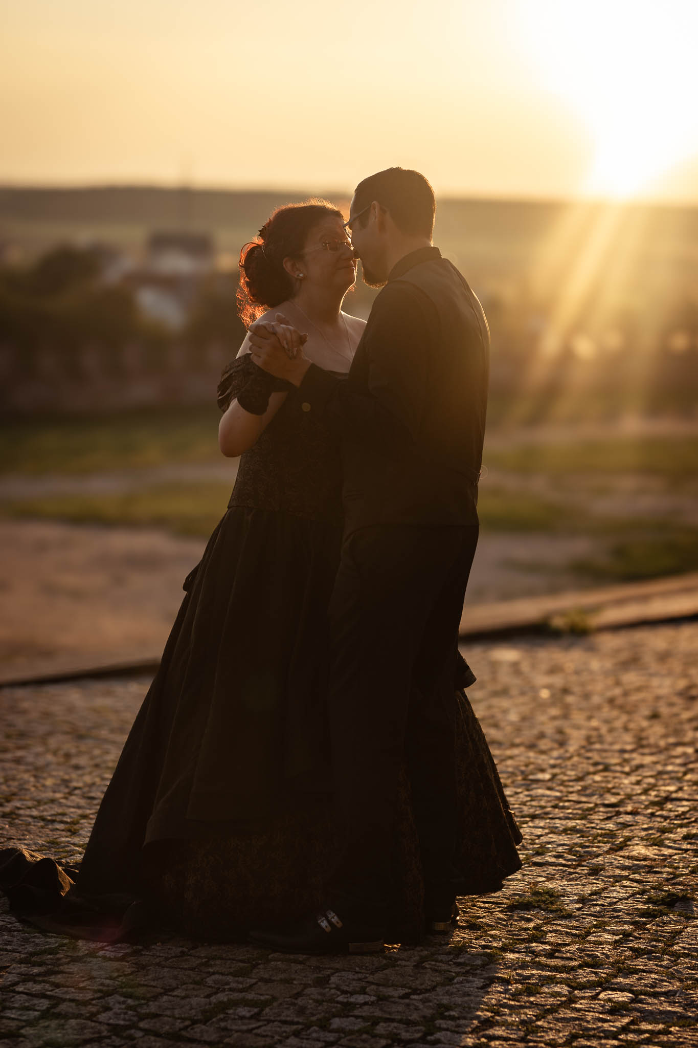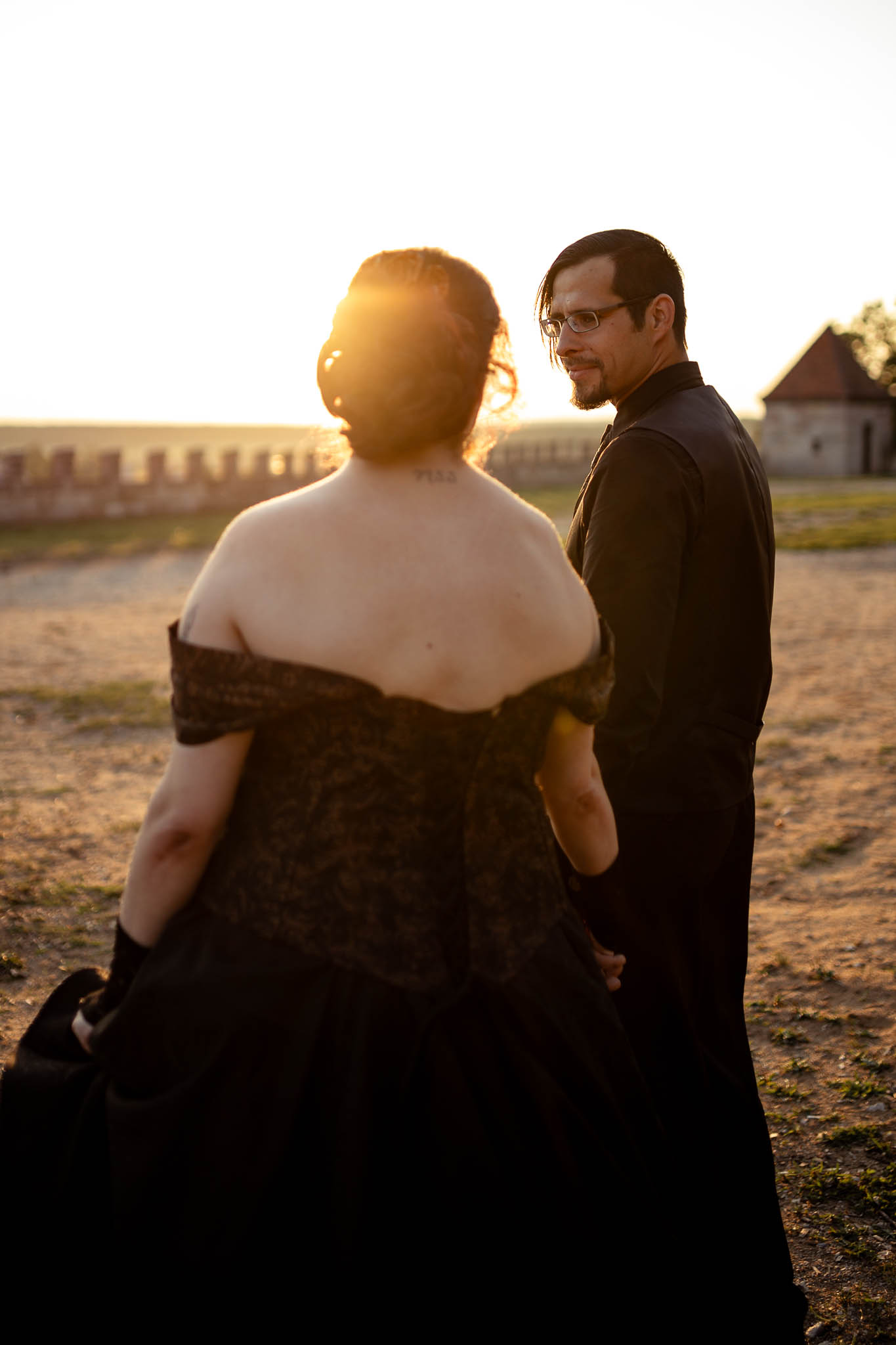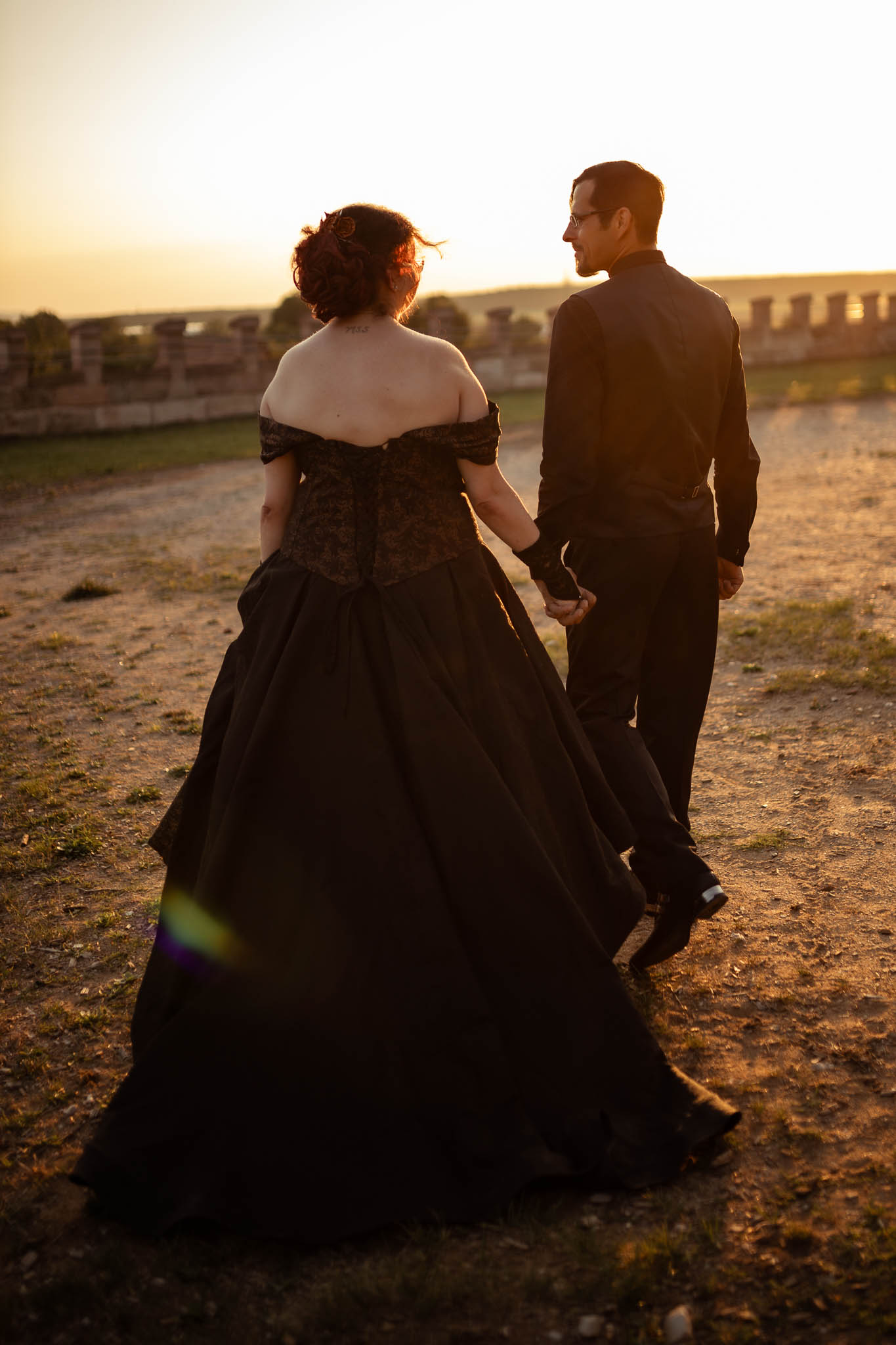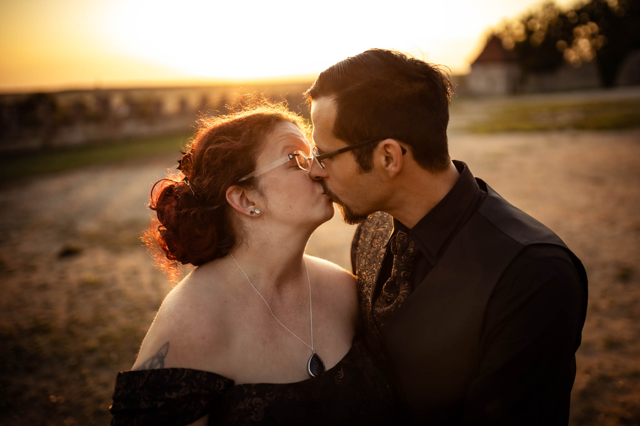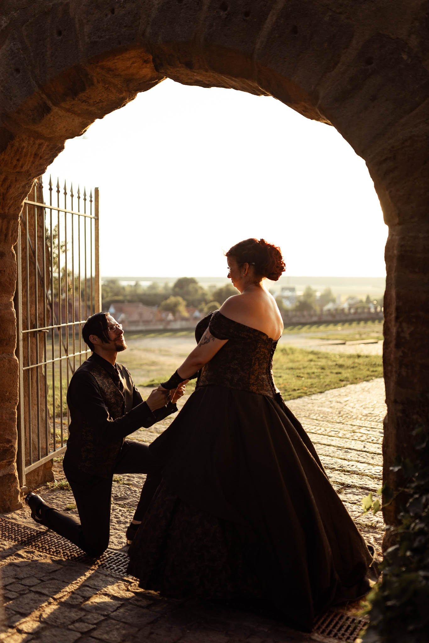 Um halb Acht Uhr, während die Gäste ihren Hauptgang genossen, klingte das Brautpaar sich mit mir für ein intimes Sonnenuntergangsshooting am Turnierplatz der Burg für einige Minuten aus. Diese Momente der Zweisamkeit waren für Martina und Marco besonders wertvoll, da sie in der atemberaubenden Abendstimmung, die die Burg umgab, ihre Liebe in Ruhe genießen konnten. Das Licht war perfekt – die goldenen Strahlen der untergehenden Sonne tauchten die Szene in eine fast magische Atmosphäre, die durch das Schwarz ihrer Outfits noch verstärkt wurde. Hier zeigte sich wieder einmal, warum ihr euch unbedingt die Option auf ein Sundownshooting an eurem Tag mit ein wenig Spielraum im Zeitplan um die entsprechende Uhrzeit offenhalten solltet. Und ich kann euch beruhigen: Auch für Martina, Marco und mich war nach unserer Rückkehr noch genu zu essen übrig, bevor dann noch das Dessert in Form von gefüllten Pfannkuchen mit Eis serviert wurde.