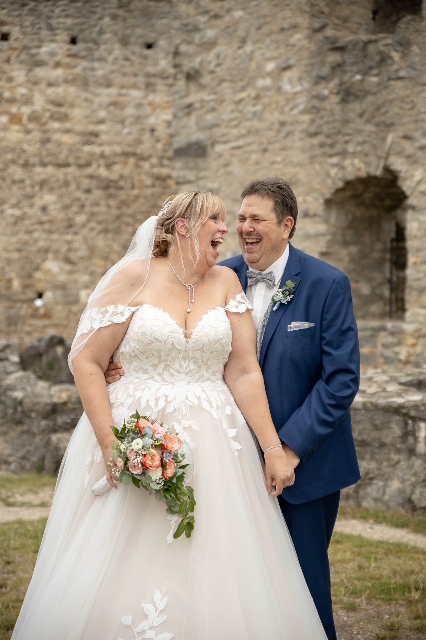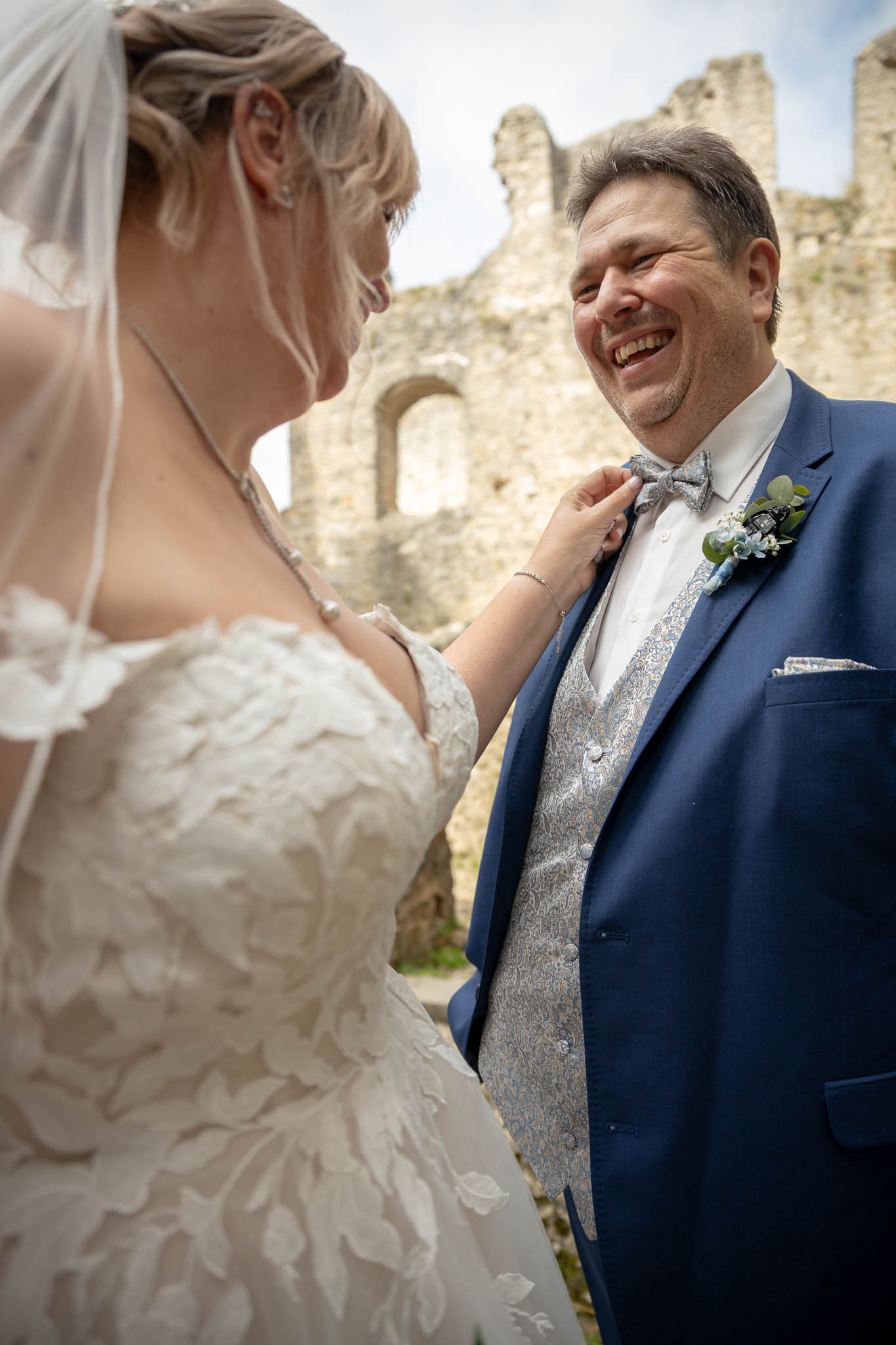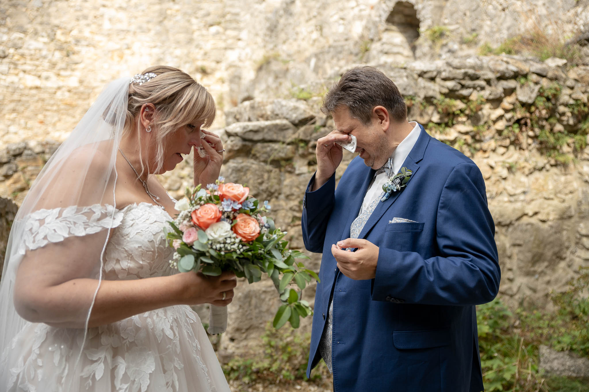 Als Karsten seine zukünftige Braut Betty zum ersten Mal in ihrem atemberaubenden Brautkleid von Hanna Jech sah, konnte er seine Emotionen nicht zurückhalten. Es war ein unglaublich bewegender Moment, als er, mit Tränen in den Augen, die Schönheit seiner Braut bewunderte. Betty, ebenso ergriffen, musste ebenfalls zum Taschentuch greifen. Diese intensiven Gefühle, eingefangen in den historischen Gemäuern der Burg, machten das First Look Shooting zu einem der emotionalsten Momente des Tages.