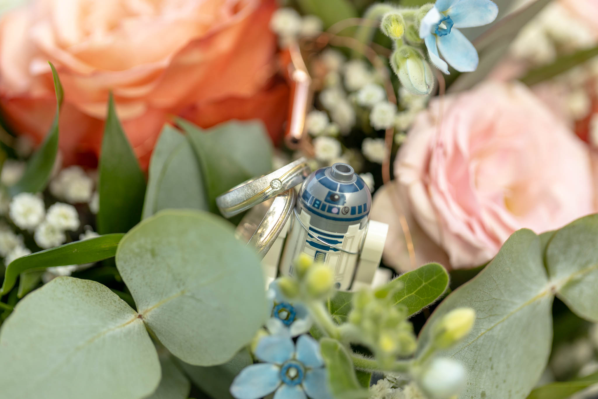 Die Hochzeit von Betty und Karsten war nicht nur durch die Zeremonie, sondern auch durch die vielen liebevollen Details einzigartig. Als großer Star Wars-Fan war ich begeistert, überall kleine Anspielungen auf das Star Wars-Universum zu entdecken. Von dezent platzierten Figuren auf den Tischen bis hin zu subtilen Hinweisen in der Dekoration – diese Details zeigten die gemeinsame Leidenschaft des Brautpaares und gaben der Feier eine persönliche Note, die einfach unvergleichlich war.