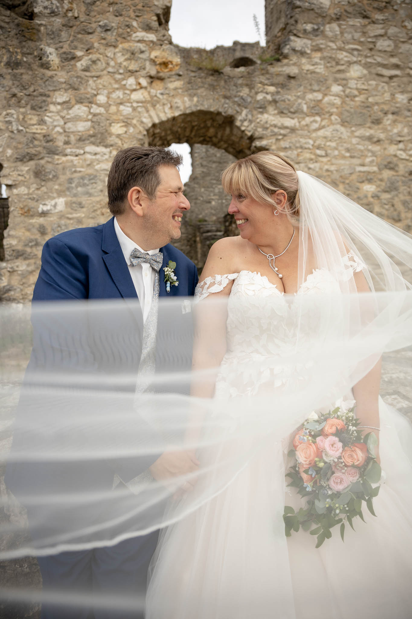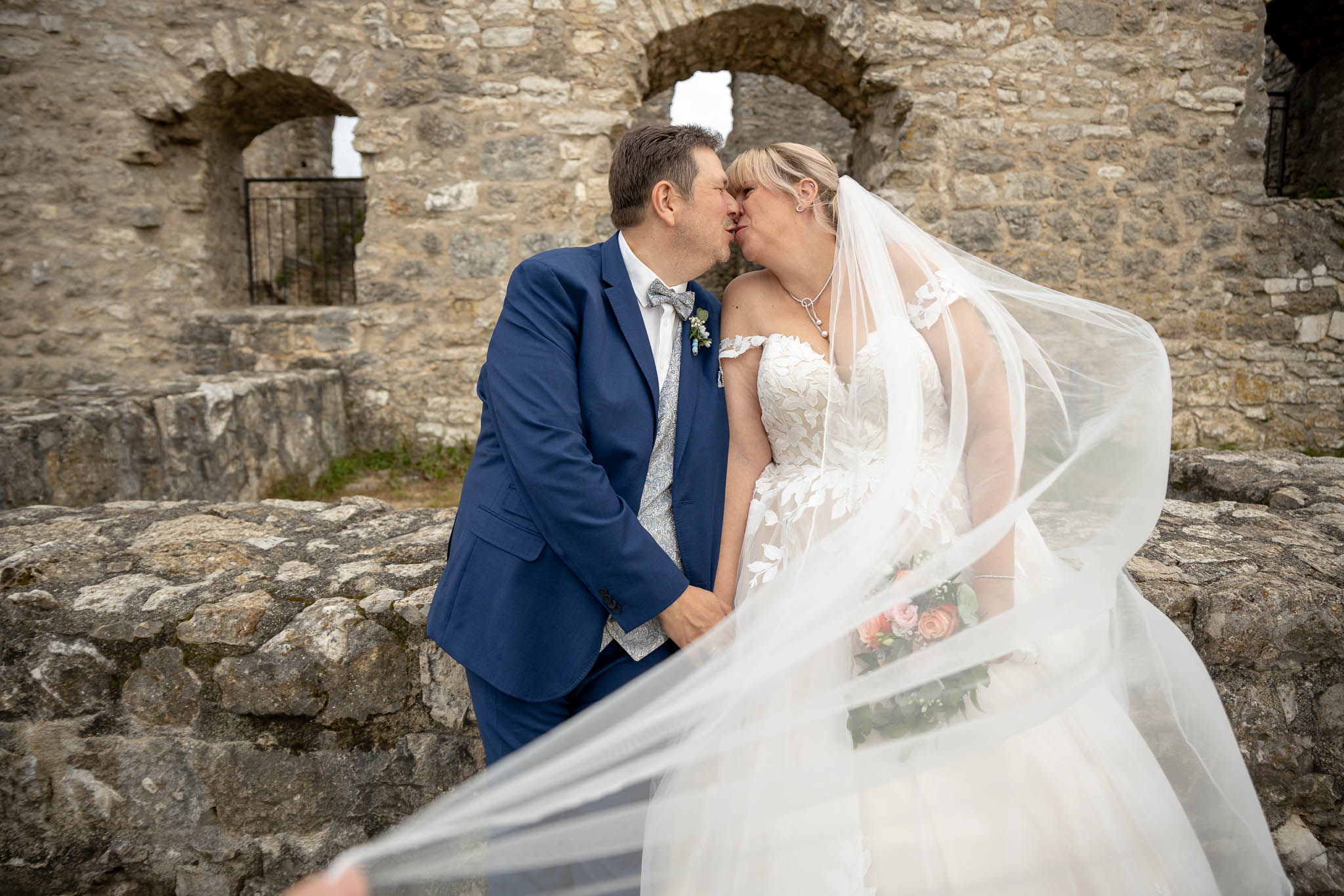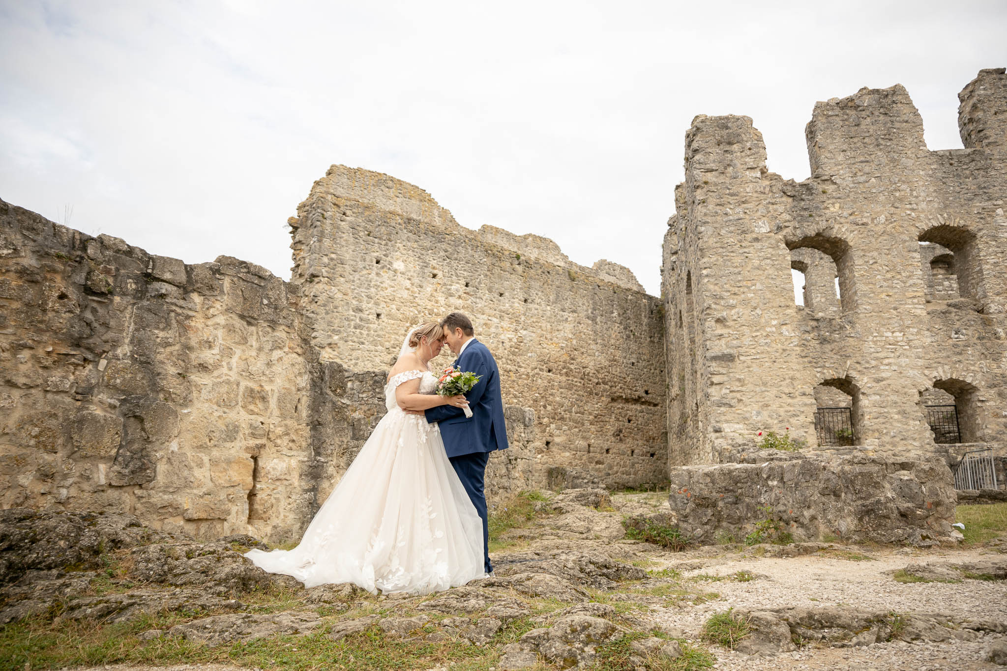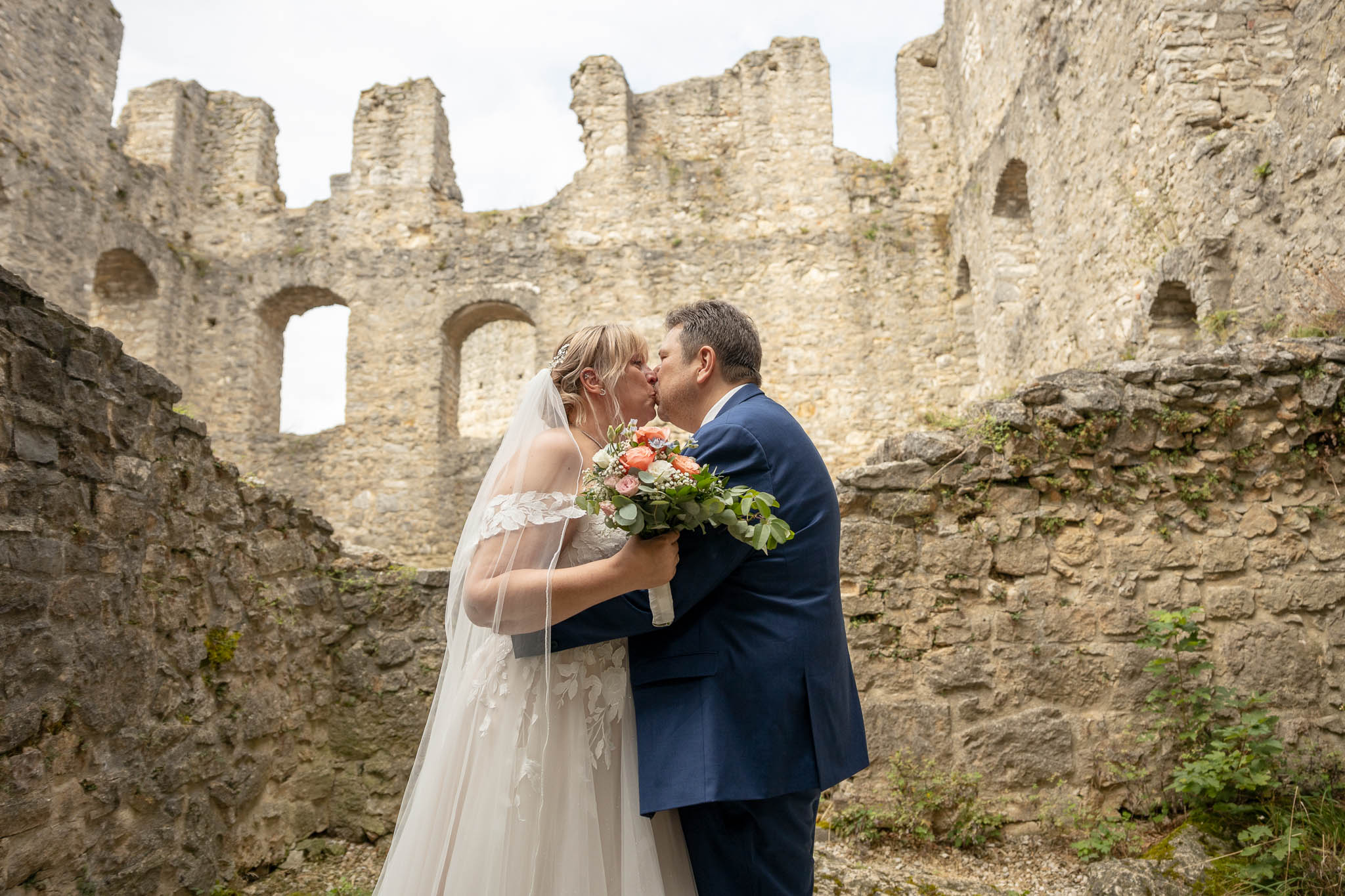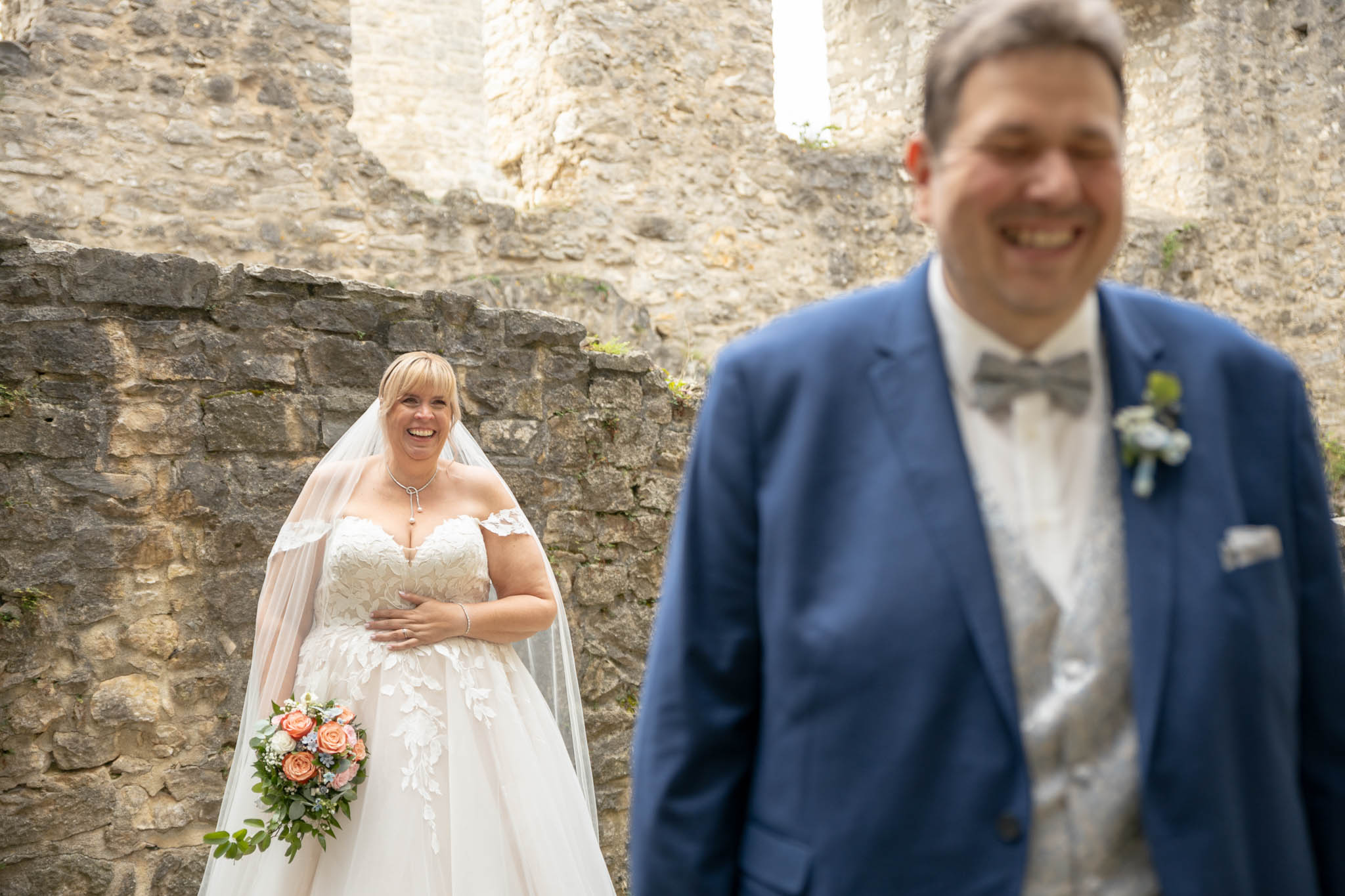 Um 10:30 Uhr trafen wir uns an der Burg Wolfstein, einem historischen Juwel, das uns eine atemberaubende Kulisse für das First Look Shooting bot. Die blendende Sonne stellte uns Fotografen vor eine Herausforderung, doch die vielen schattigen Ecken der Burg halfen, das Licht optimal zu nutzen. Ich entschied mich, den Bräutigam in einem der Innenräume der Burgruine zu platzieren, wo die alten Mauern eine intime und doch majestätische Atmosphäre schufen.