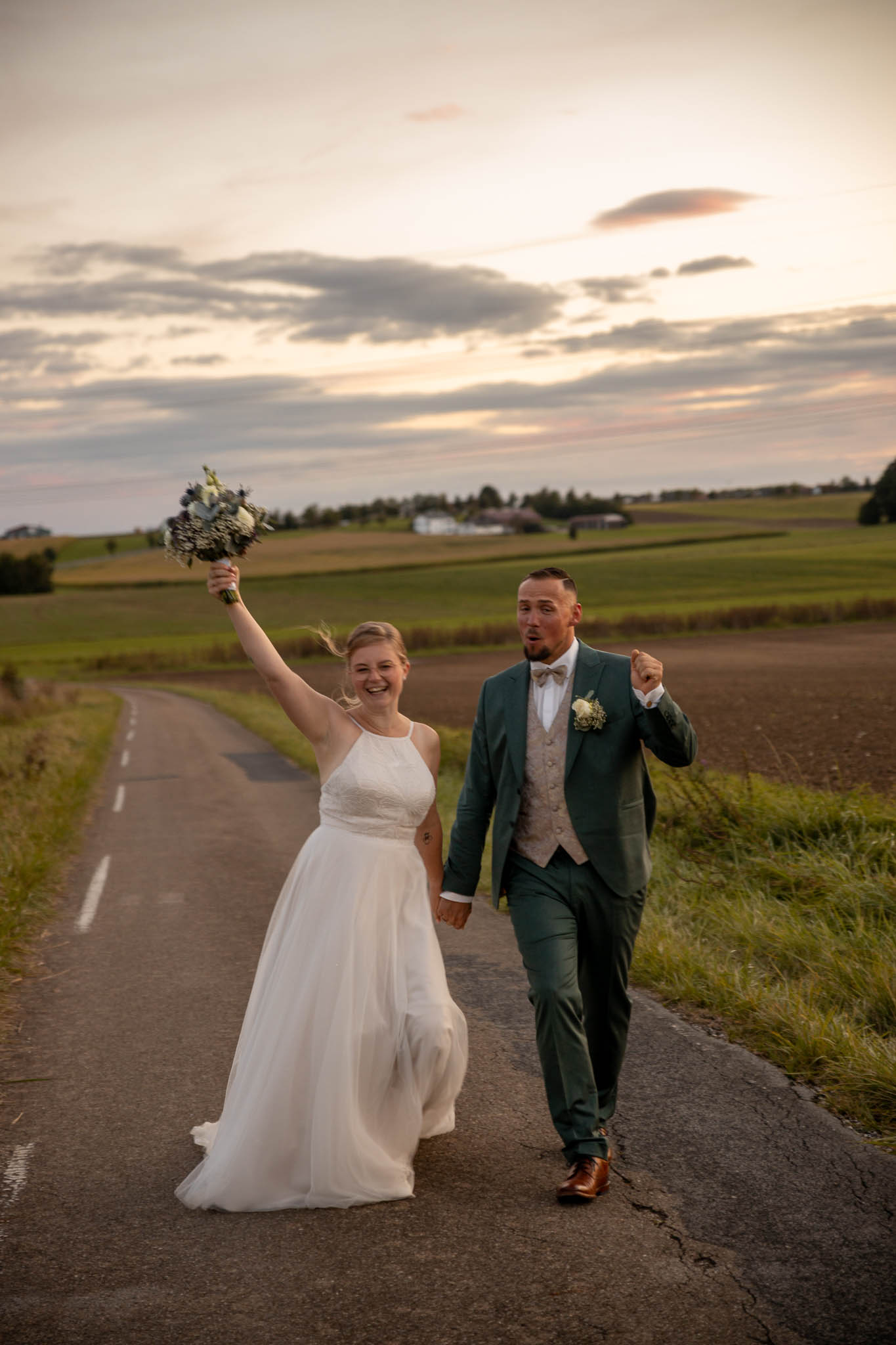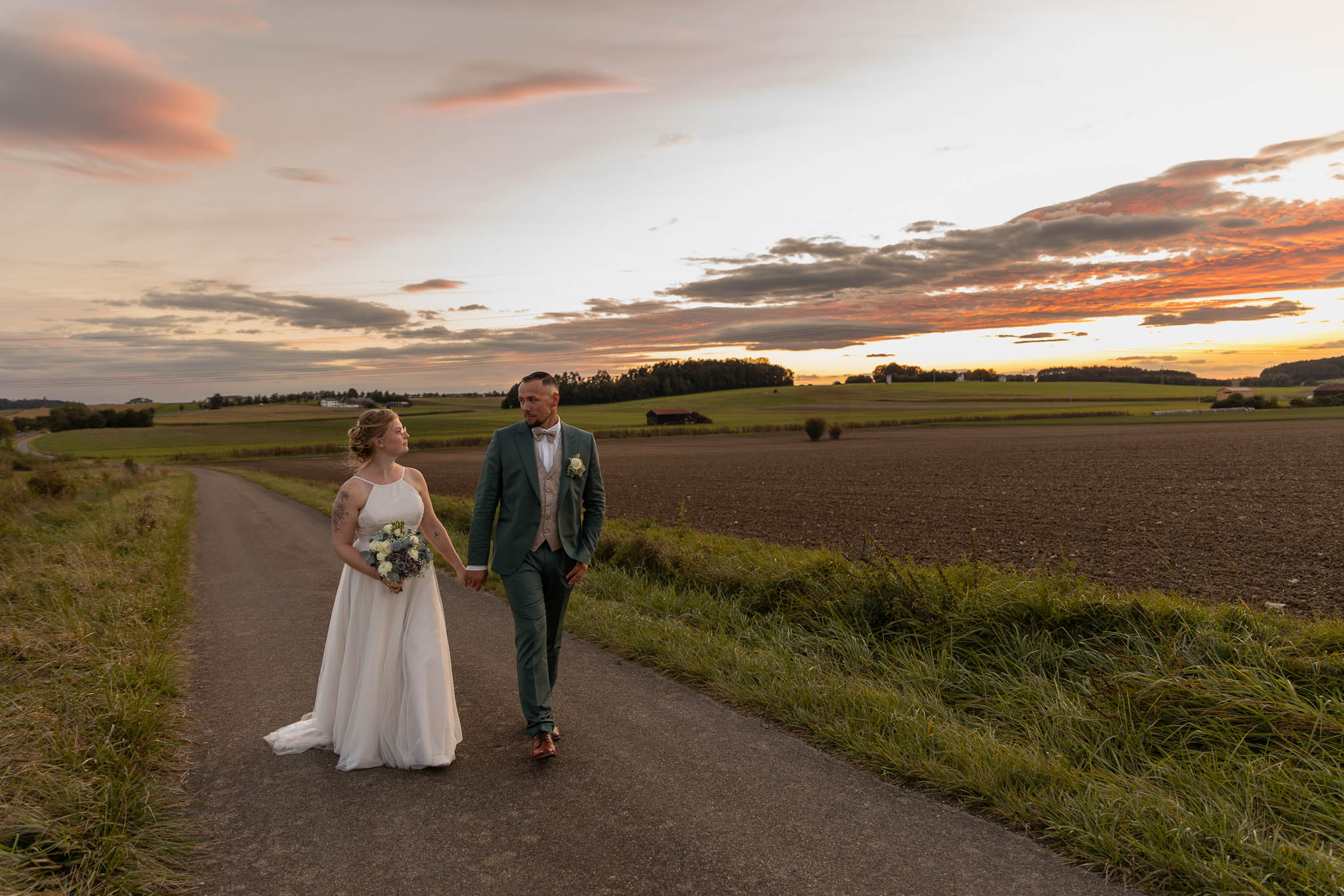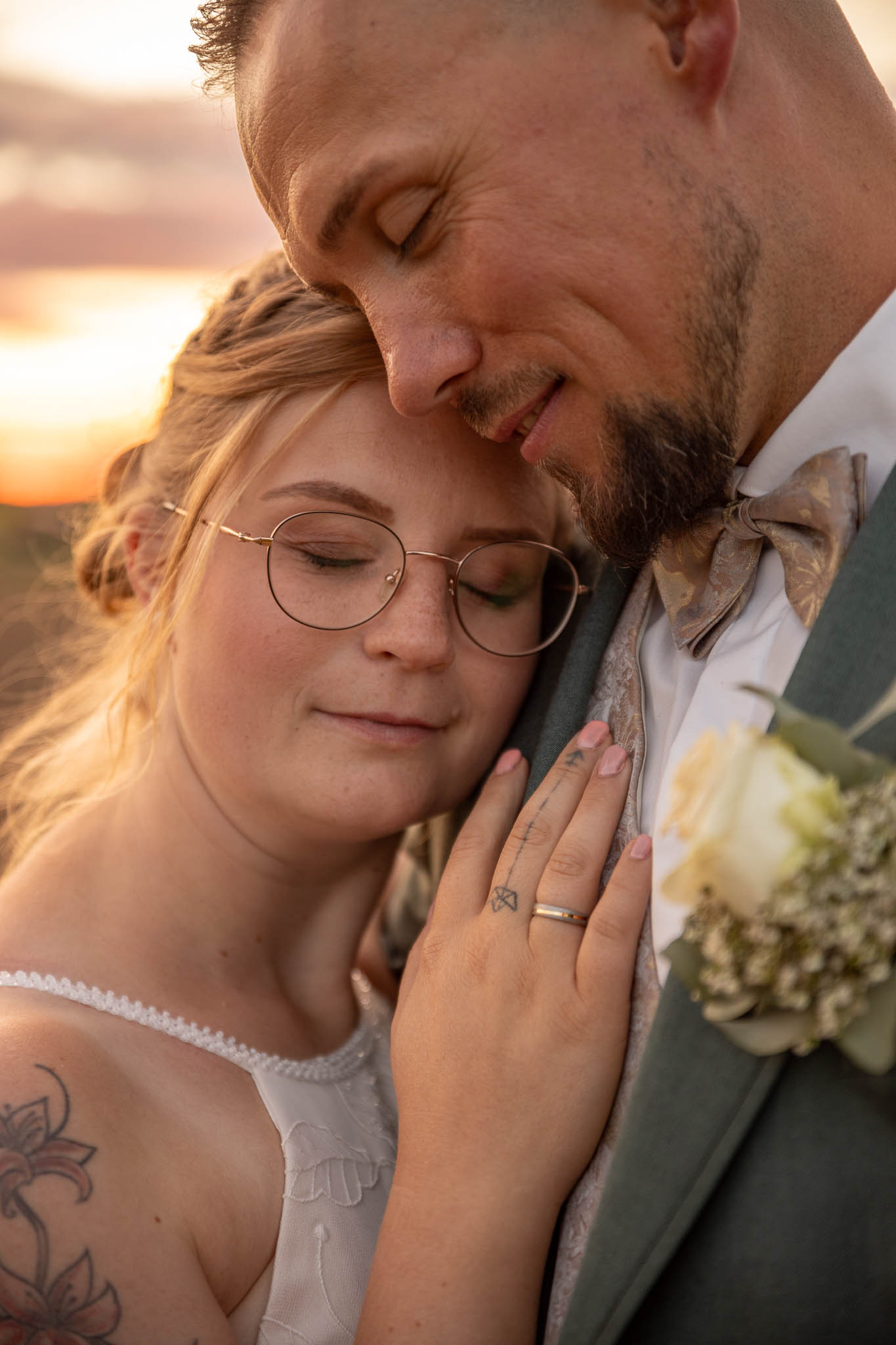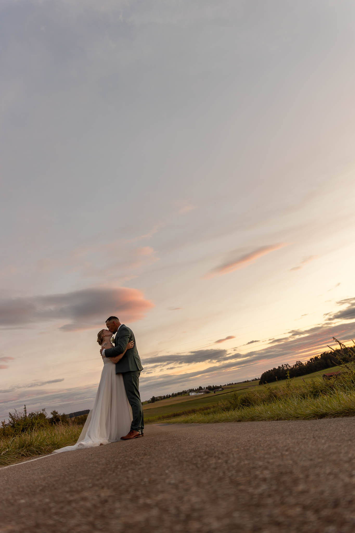 Stunden voller Liebe, Spass und bleibender Erinnerungen später wünschte sich mein Brautpaar dann aber doch nochmal einen Versuch mit ein paar weiteren Shootingbildern und was soll ich sagen: Auch wenn wir für das klassische Sundownshooting in der sogenannten Goldenen Stunde leider zu späat waren wurden beide blohnt mit einem wunderschönen lila-orangenen Himmel der letzten Sonnenstrahlen und konnten sich so weitere wunderschöne Bilder in ihren tollen Hochzeitsoutfits als bleibende Erinnerungen sichern.