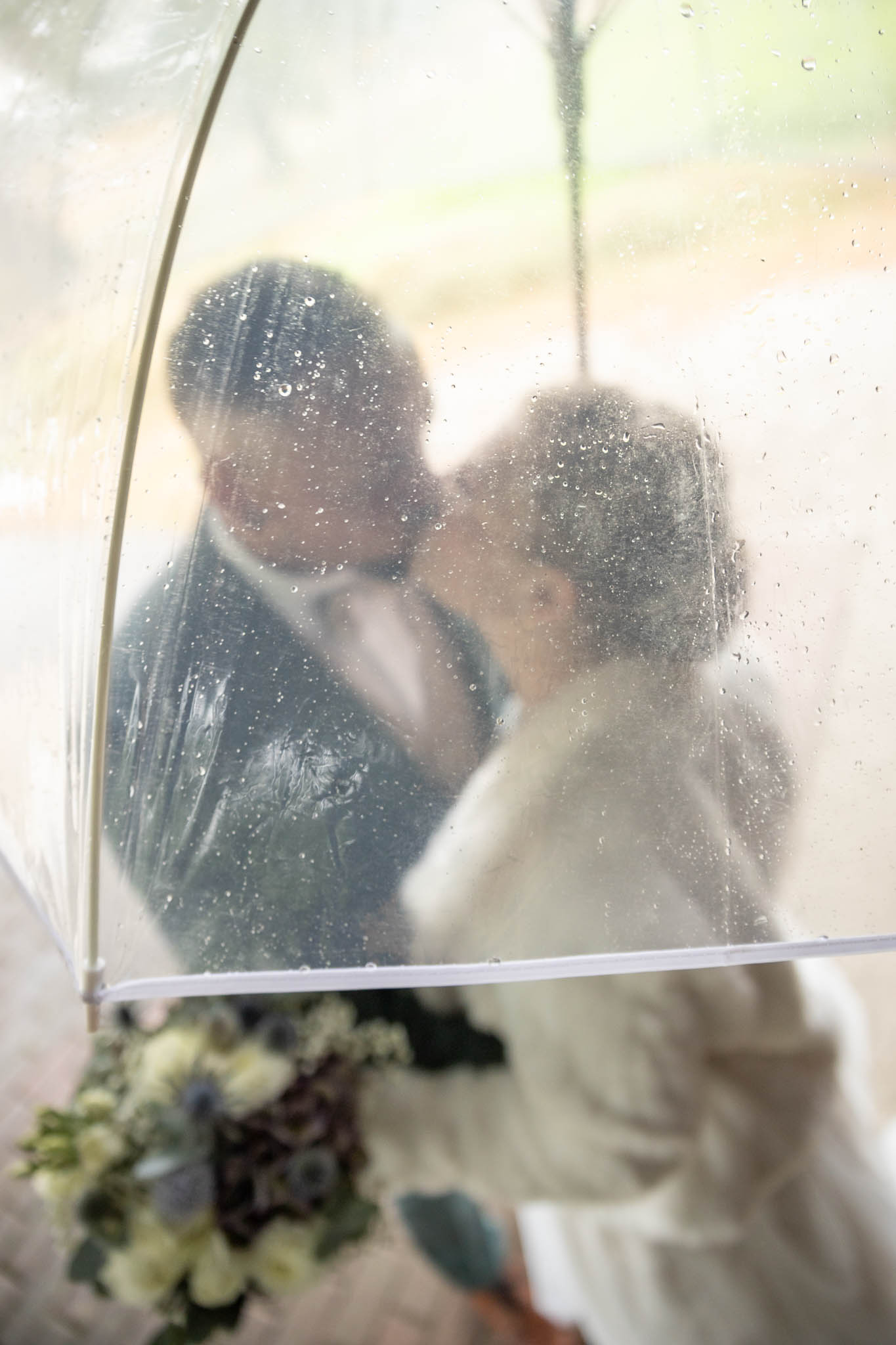 Auf dem Weg zum Getting Ready bei meiner Braut zuhause wurde mir schon klar: Wir haben zwar noch ein bisschen Zeit bis zum Shooting, aber das wird diesmal nicht trocken, so wie erhofft. Ich war früh dran, also bin ich schnell ein wenig über die Felder rund um den Wohnort meines Paares gefahren und hatte Glück: Eine Bauernscheune ganz in der Nähe als Holz mit einem schönen Vordach wurde kurzum zur neuen Shootinglocation gewählt. Schöne neutrale Regenschirme habe ich mittlerweile standardmäßig bei Hocheziten im Kofferraum gleich neben meiner Kameraausrüstung liegen. Und so war auch der Regen schnell vergessen, als ich die beiden zu ihrem Aufeinandertreffen begleiten durfte. Unter so einem Regenschirm ist es gemütlich und kuschelig und ihr müsst eben ein bisschen näher zusammenrutschen – das wichtigste: Nicht die Stimmung vermiesen lassen und trotzdem den Tag genießen.